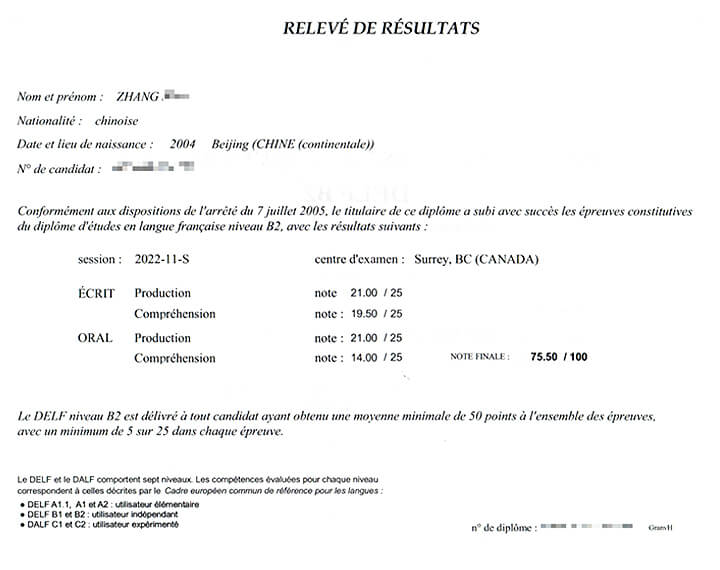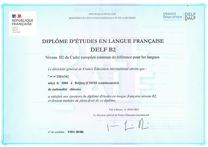 通过不断努力和练习,我仅用了三年时间,便从零攀升到B2水平,这使我感到非常自豪。同时,2019年开始,我在中学的法语一直以近乎满分的成绩保持全优的纪录,这为我申请大学提供了非常有力的支持。